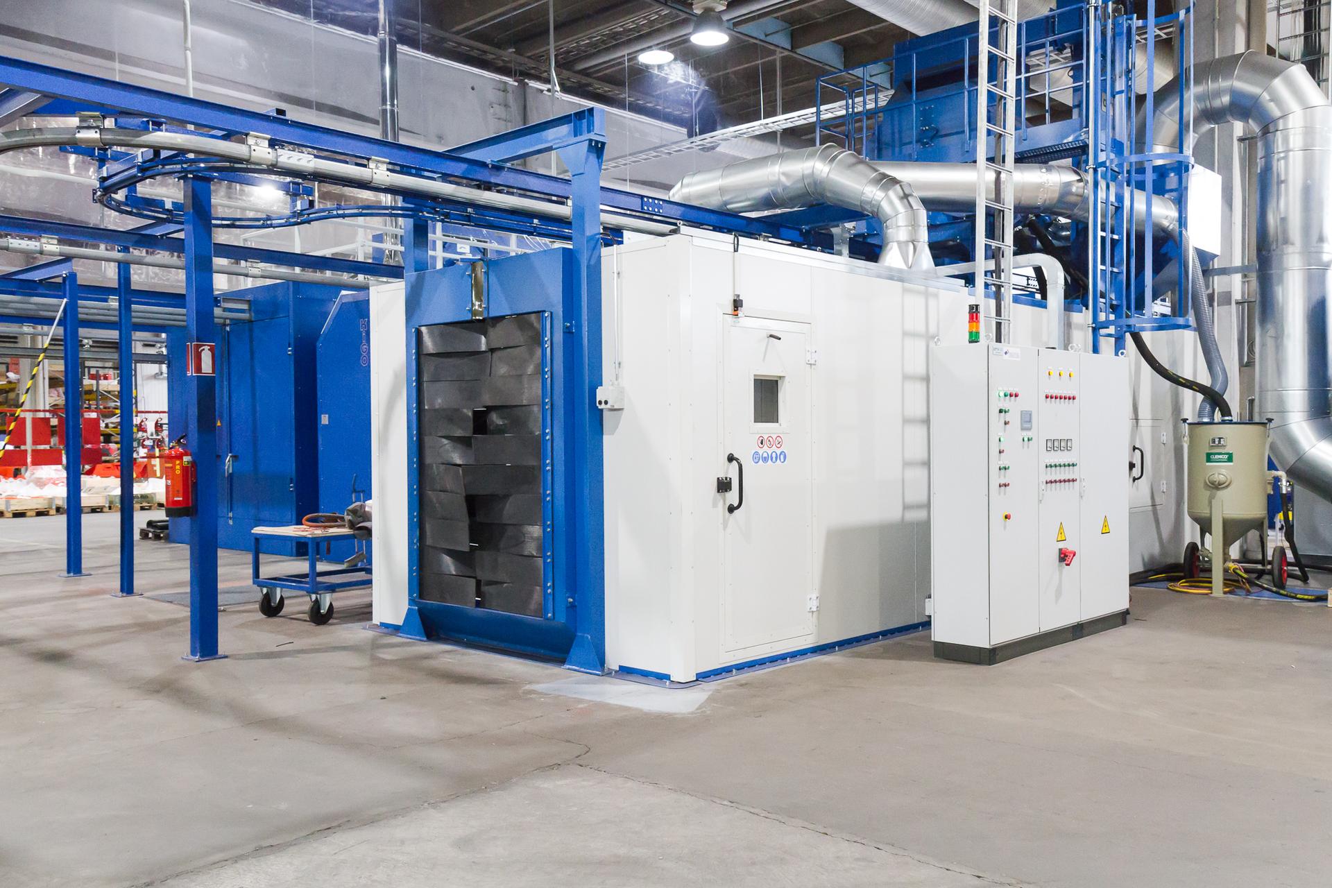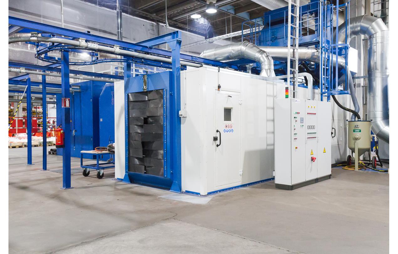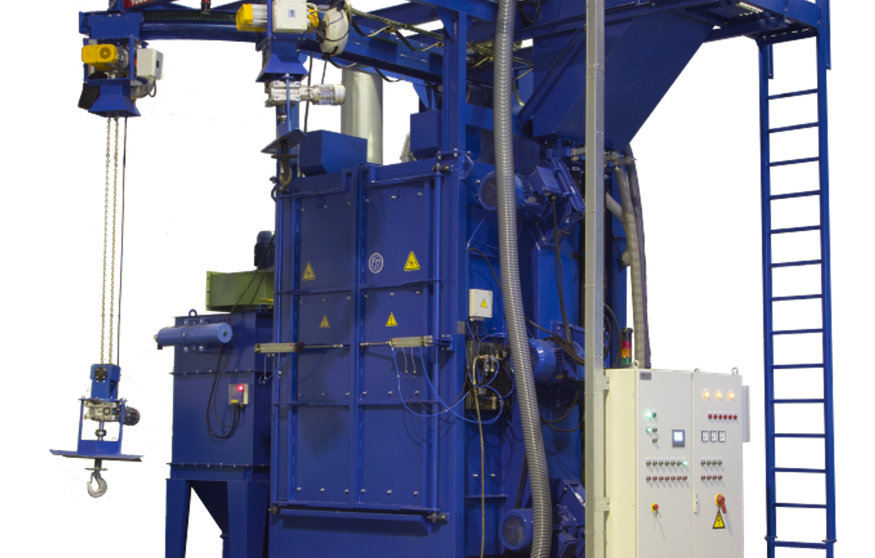 Die Elektromotoren der Strahlmaschine drehen die Turbinen, wodurch das Reinigungsgranulat eine Aufprallgeschwindigkeit von ca. 70 m / s auf die Oberfläche des zu reinigenden Werkstücks erreicht. Das Strahlen ist fast zehnmal schneller als das manuelle Strahlen, jedoch nicht für alle Werkstücke geeignet. Das geblasene Material wird in das Granulat-Umwälzsystem zurückgeführt, das die Zirkulation in einem geschlossenen Kreislauf und eine effiziente Staubabscheidung gewährleistet.