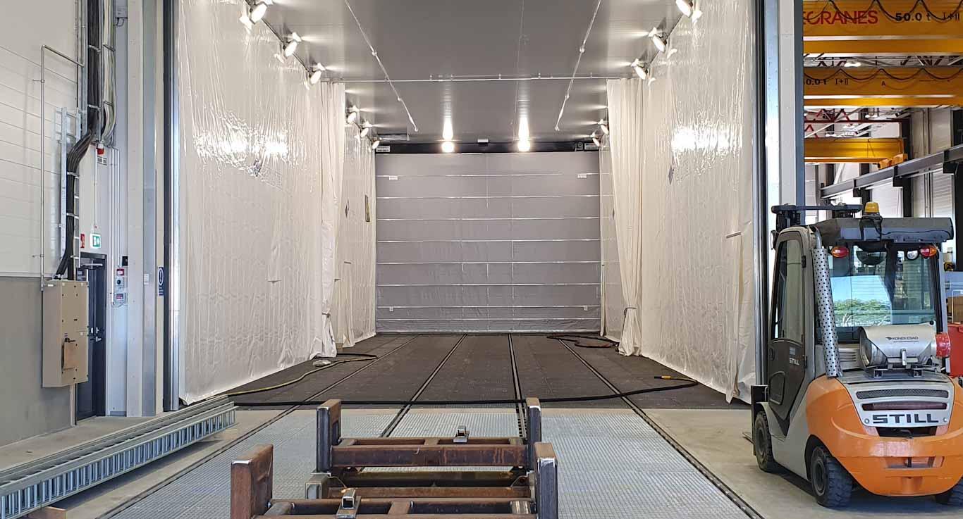 Die Bodenkonstruktion wird für eine geeignete Belastung mit 3–5 Tonnen pro Rad ausgelegt, wobei auch bis zu 10 Tonnen pro Rad üblich sind. Höhere Lasten können mit Schienen oder festen Fahrspuren zwischen den Gittern übertragen werden. Für unsere Strahlanlage liefern wir eine Bodenkonstruktion mit einer maximalen Tragkraft von 175 Tonnen.